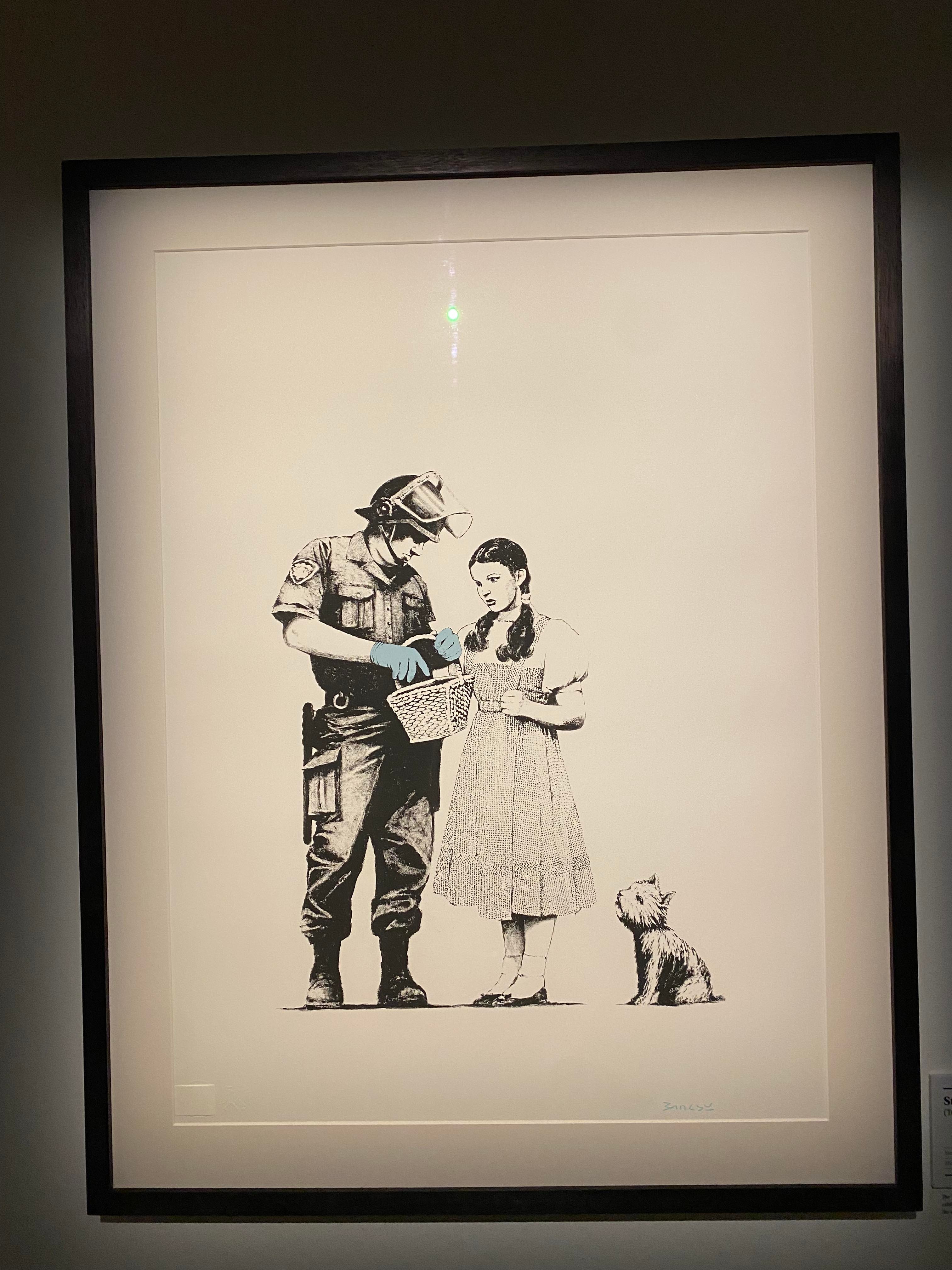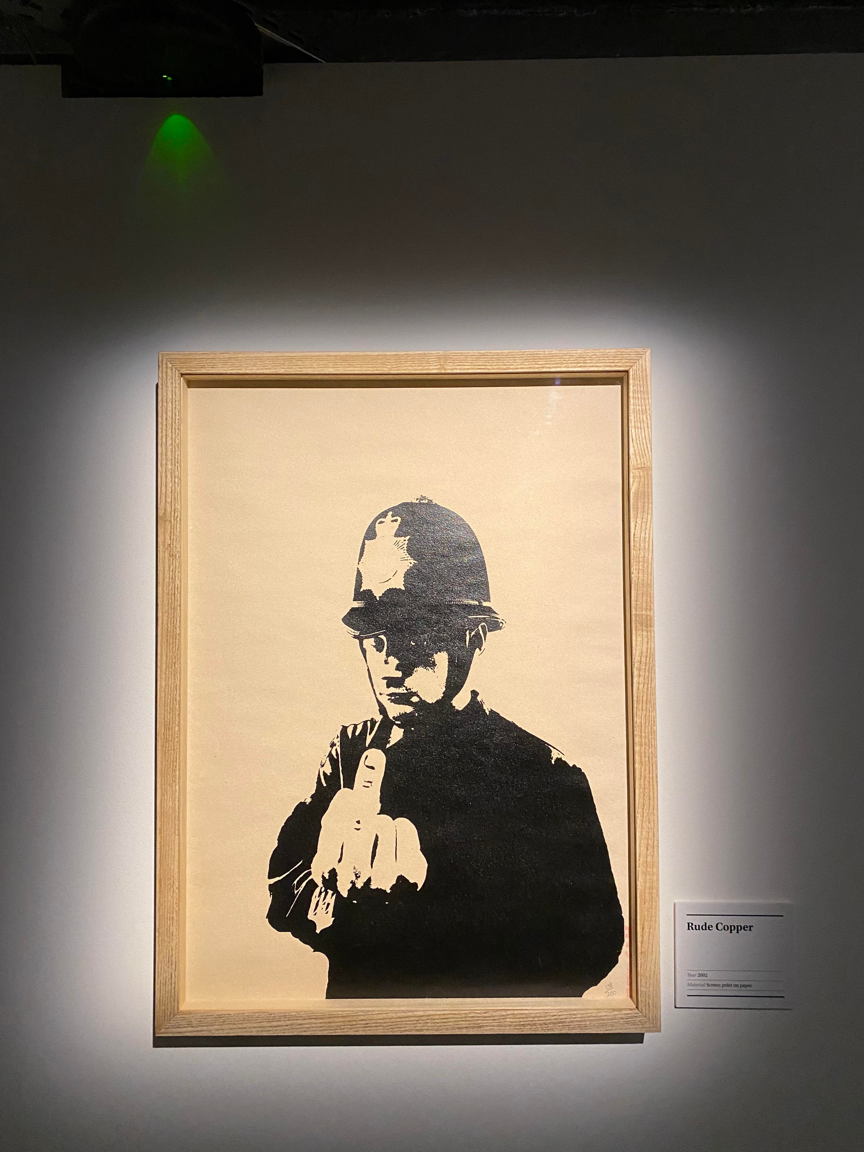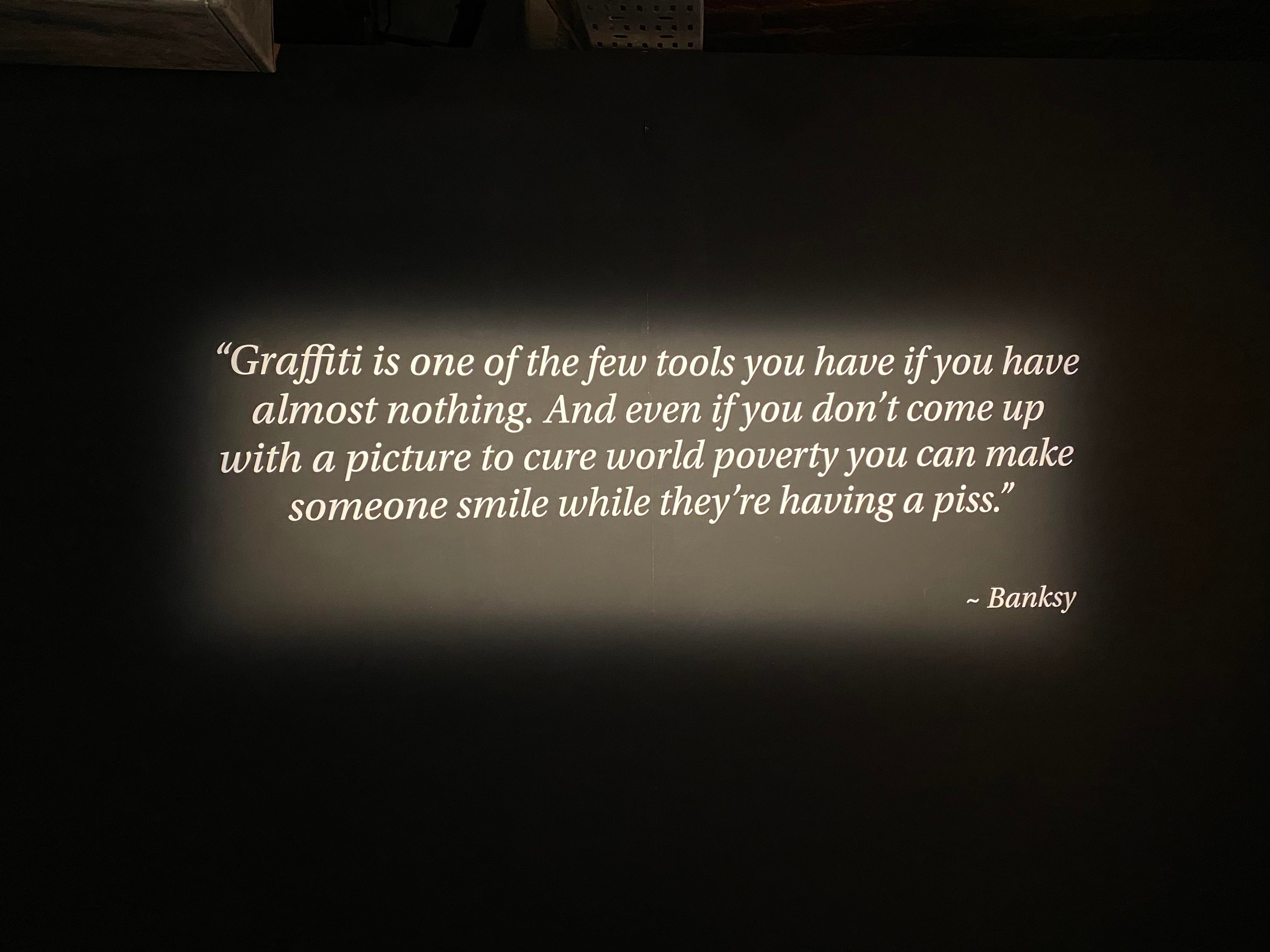 Walking down the steps of the Earlham Street warehouse, the site of ‘The Art of Banksy – the unauthorised private collection,’ I was looking forward to seeing the girl with the red balloon and felt somewhat cultured as I had forked out a few quid for the privilege. The darkened temporary gallery oozed defiance and I was immediately drawn to the pragmatic insurrection, with a whiff of the whimsical as typified by this quote: