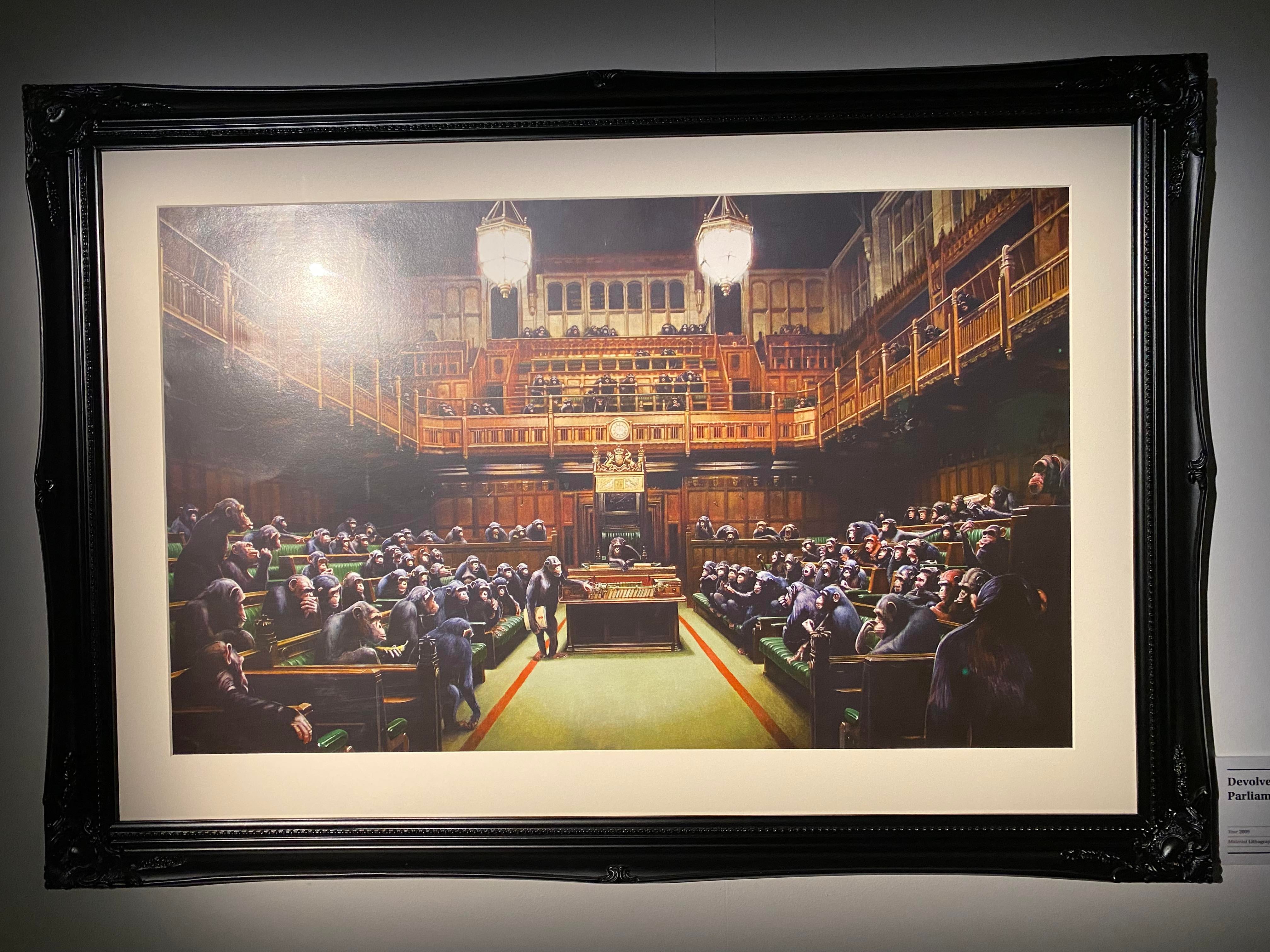 The next three illustrations spoke directly to me. Since 2016 the UK has been in a divisive political tailspin. Our elected chamber, as portrayed here by Banksy, has failed –