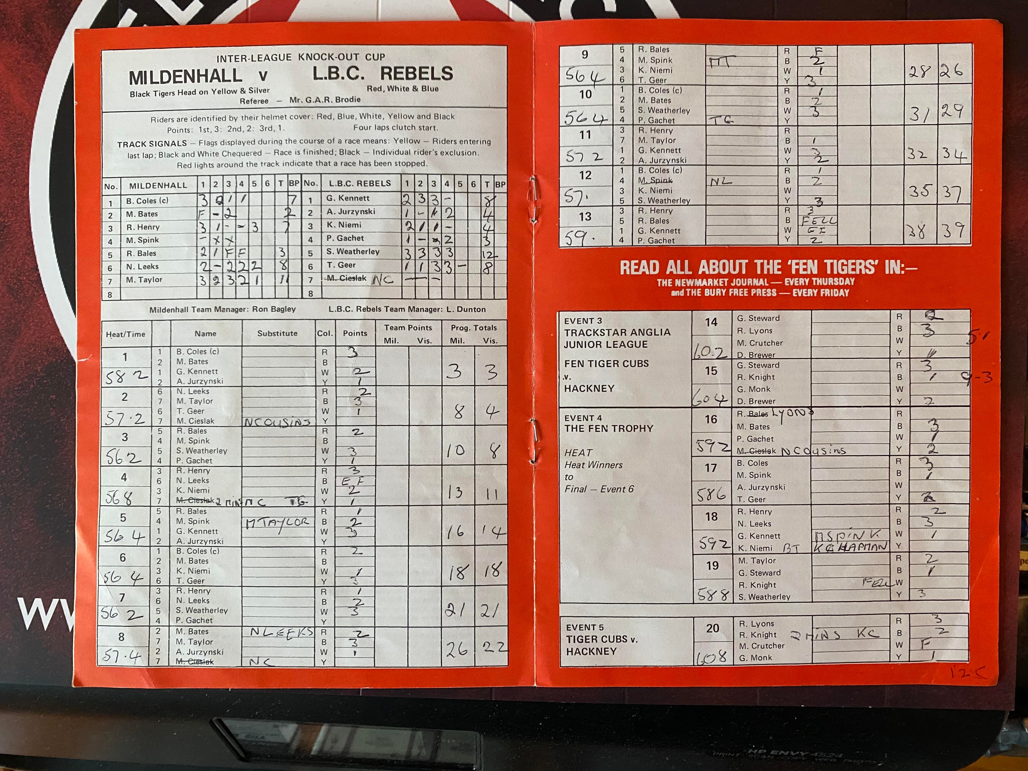 Graham let me down very gently, although gave me some cheer in that early speedway programmes do extremely well. However, if I had an Ivan Mauger helmet knocking around, he would be very excited! Asked about the saleability of completed or blank programmes Graham concluded that there are two camps of collectors – those that favour a literal account, scribbles, the all-important heat times and the odd fold, and the purists who demand a blank, pristine, and high-quality product. On balance the latter had a higher value. Autographed copies also create a significant uplift. As a result, from this season onwards, in order to bolster my own financial portfolio I will buy two, placing one in a hermetically sealed plastic folder after harassing every rider to sign it!