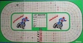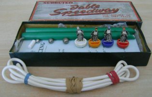 I’m in agreement with this sentiment since, like the football counterpart, skill played a factor. Angles akin to snooker, and pinpoint contact with the ball bearing often propelled the rider along the straight like a bullet! The advertising spiel was, to say the least, a tad flamboyant – “The patented apparatus enables the reproduction of different gear ratios to be selected… Machine somersaults and over slides, bumping, track records and lap dashes are all contained in the game… as in real Speedway ─ the rider who can follow the white line and gates successfully is generally the winner” ─ since the gear ratios would have been different sized ball bearings, when only the biggest one would do the trick!